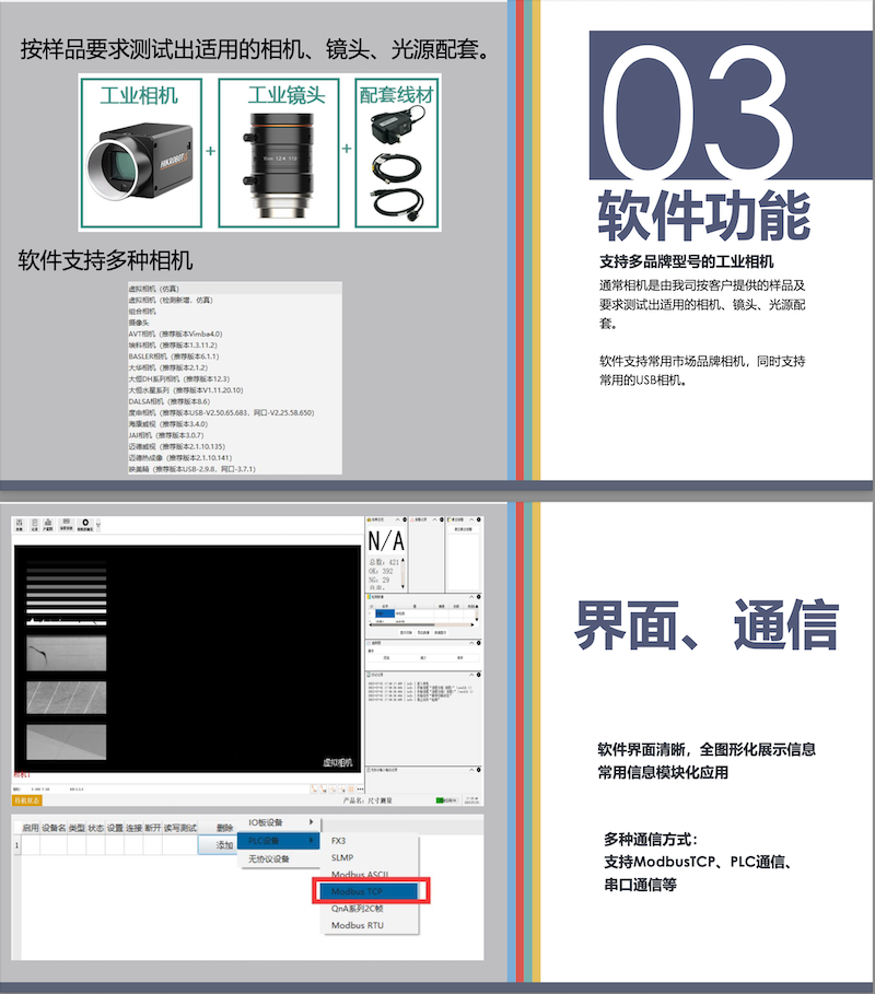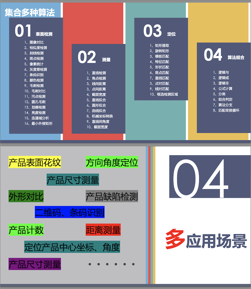 圖像對比 相似度檢測 刻線檢測 斑點檢測 像素統(tǒng)計 灰度差檢測 條碼識別 顏色檢測 毛刺檢測 毛刺對比 污點檢測 圓孔毛刺 劃痕檢測 亮度檢測 連通域分析 最小外接矩形 直線檢測 角點檢測 線間距離 點間距離 截面寬度 直線擬合 圓形擬合 曲線擬合 機械坐標轉(zhuǎn)換 直線間角度 截面寬度 矩形提取 旋轉(zhuǎn)矩形 模板匹配 特征匹配 形狀匹配 斑點匹配 直線匹配 點對匹配 線對匹配 框選檢測區(qū)域 邏輯與 邏輯或 邏輯非 公式計算 分類 組合判定 算法分支 匹配變換循環(huán)