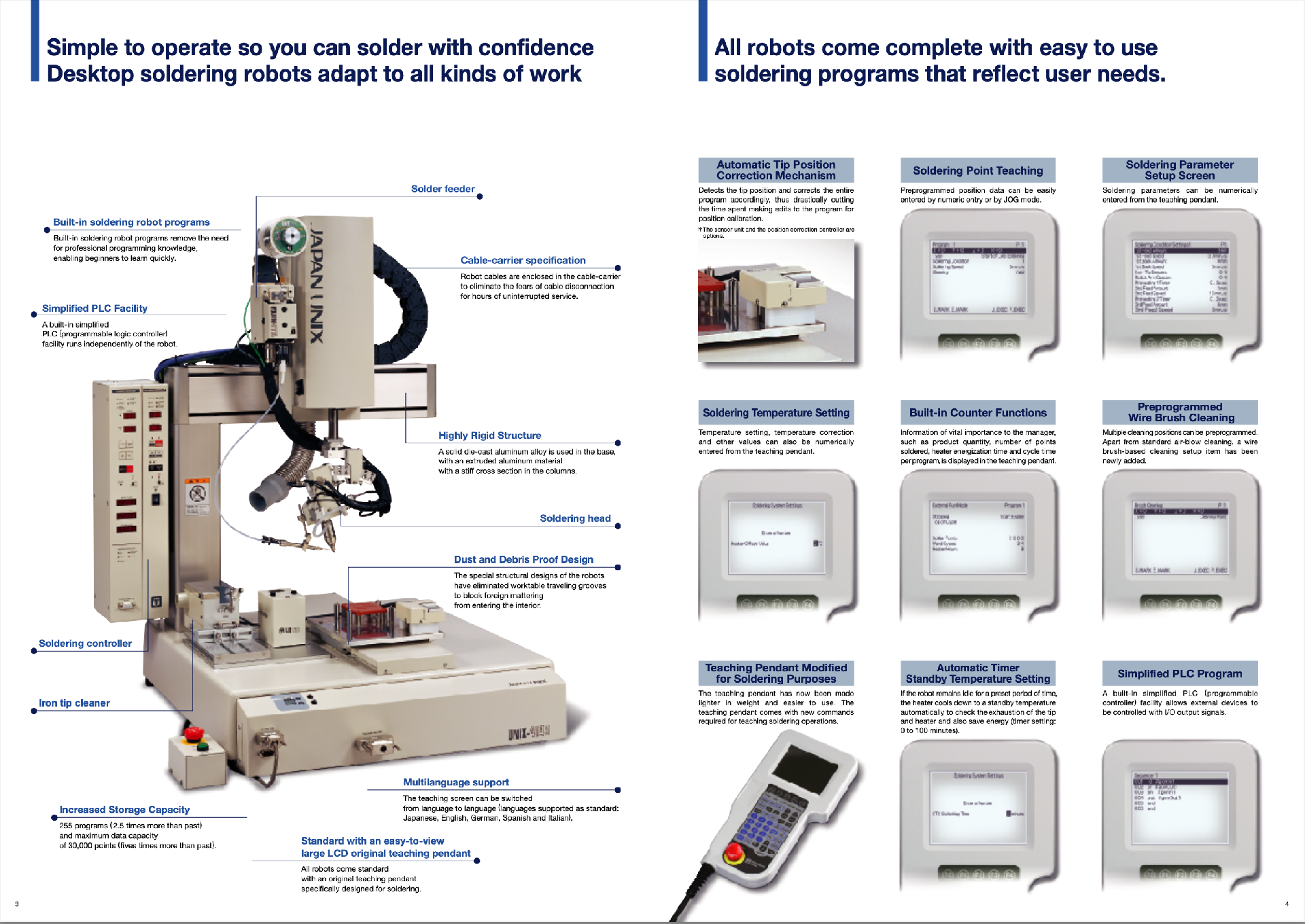 JAPAN UNIX 站在世界最前端的焊錫設(shè)備制造商。2002年投產(chǎn)的UNIX-410系列桌面型焊錫機(jī)器人業(yè)已成為眾多世界500強公司的首選,至今仍在客戶處正常生產(chǎn)使用。